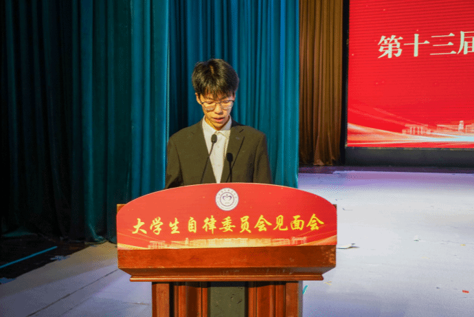第十三届大学生自律委员会主席张芷硕代表新一届学生干部发言。他郑重承诺,全体成员将以忠诚立身、以责任践行、以实干成事,在自律中成长,在服务中担当,坚守初心、坚定信念、坚持理想,在实际工作中真正做到服务师生、履职尽责。
