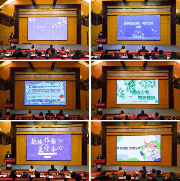 随后,主持人宣读评比细则,各班级代表依次上台,围绕“零作弊”班级创建的具体举措展开分享。从深入推进班集体诚信建设,到班级内部实施学习互助、日常监督、朋辈引领等多元举措,全面展现了各班级在培育优良班风、学风方面所做的扎实努力,彰显了我校学生在日常学习与生活中践行学术诚信、自律严谨、积极向上的精神风貌。
