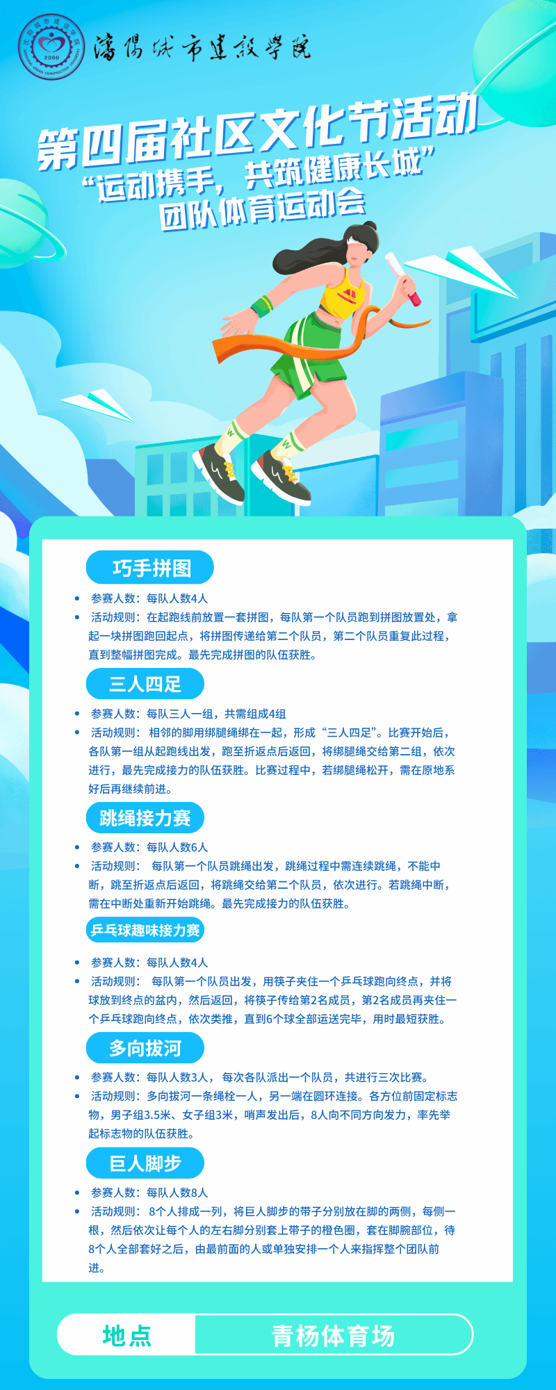 为深入贯彻落实“五育并举”育人理念,充分发挥学生社区育人阵地作用,深化“一站式”学生社区建设内涵建设,增进社区成员间的交流协作,以宿舍文化建设推动高品质校园文化建设,学校拟在全校范围内开展第四届社区文化节活动之“运动携手,共筑健康长城”团队体育运动会活动,现将有关内容通知如下: