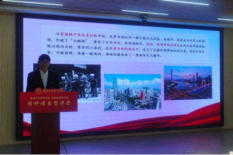 柴瑜璠同学以《新青年,到时代的大江大河中去》为题,以安徽凤阳小岗村的故事为切入点,宣讲了改革开放精神的实质内涵和在新时代的重要意义等内容,他号召当代大学生要学习前辈们敢为人先的勇气,在学习和工作中勇于创新、要发扬艰苦奋斗的精神、更要秉持开放包容的态度,与他人合作交流,共同进步。