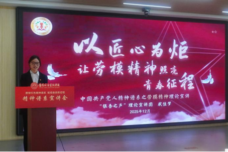 戚佳梦同学以《以匠心为炬,让劳模精神照亮青春征程》为题,以近距离接触到劳模的经历为切入点,宣讲了劳模精神的实质内涵、时代价值等内容,她号召当代大学生应该把劳模精神刻在心里、落在行动上,用匠心打磨学业,用坚持追逐梦想,让劳模精神成为我们青春最闪亮的底色。